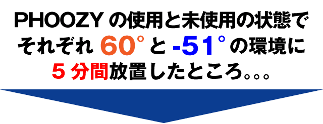 一方、摂氏-51℃の環境に5分おいたところ、PHOOZY XP3を使用していないiPhoneは表面温度-9℃まで下がりましたが、PHOOZY XP3を使用したiPhoneは表面温度23℃をキープ。