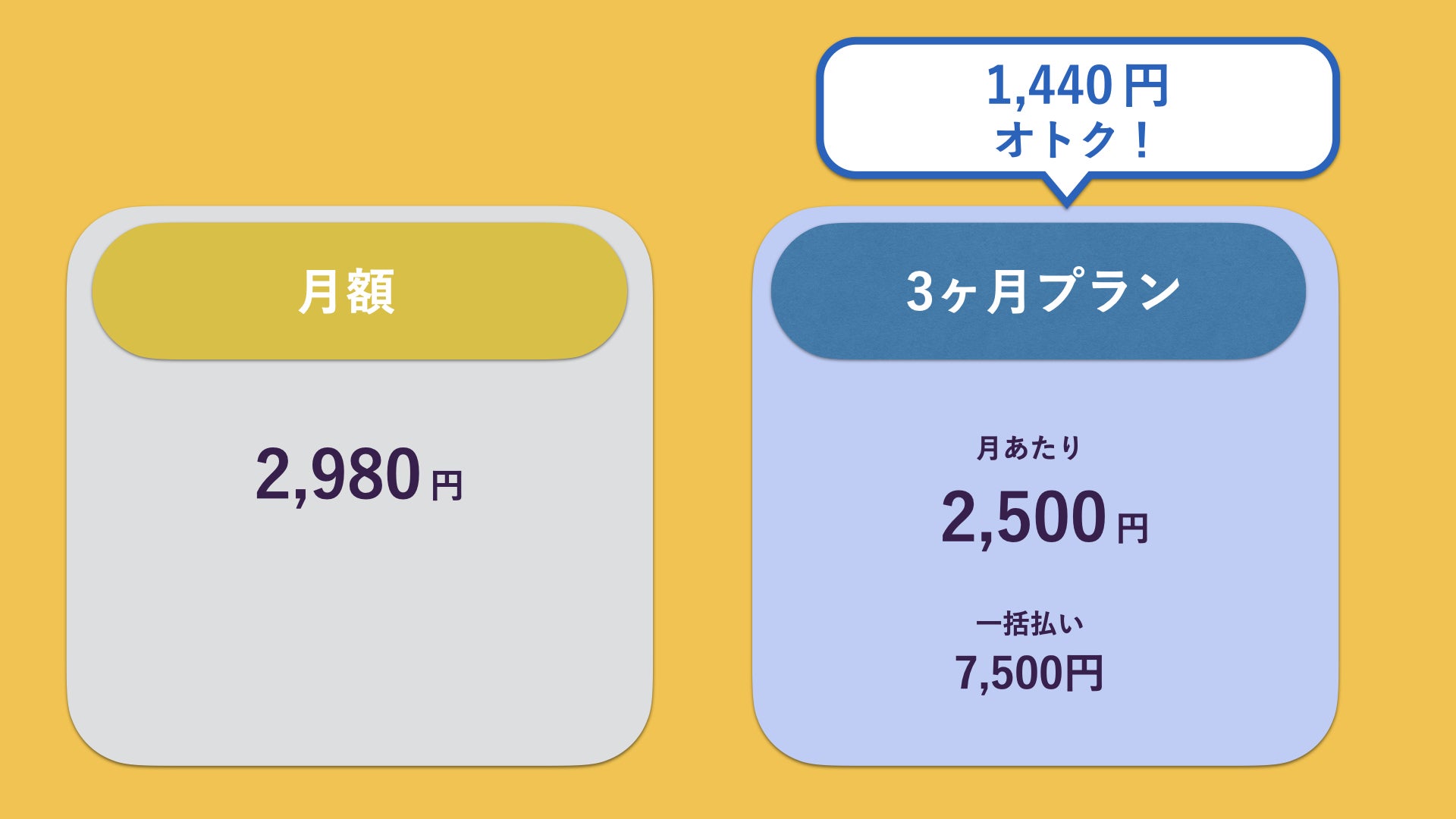 早割は10名様限定で1ヶ月(2980円)、3ヶ月(7500円)、6ヶ月(12,000円)を用意しました。早割に間に合わなかった場合は、1ヶ月(3500円)、3ヶ月(10,000円)、6ヶ月(18,900円)をお買い求めください。