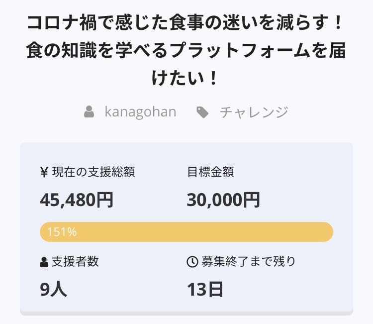 2020/12/01 12:21こんにちは!この度、本プロジェクトが目標金額を達成いたしました!ご支援いただきありがとうございます!ご支援いただく方には、リターンのサービス・品物が届くのを楽しみにしていただけたら嬉しいです。プロジェクトを始めてみて、「食事の学校って何だろう?」というお声をたびたびいただきました。私たちプロジェクトメンバーも、説明するのに四苦八苦しております。。今まで注目されてきていないサービスを生み出すのは、こんなに難しいことなんだ…と思いました。食事や食品は、毎日触れるもので当たり前であるからこそ、どこかなおざりにされてきた一面があります。その一方で日々の健康管理のために食事を気をつけている人に、食事を気をつけるきっかけを聞くと「自分が体調を崩したから」「家族など周囲の人が体調を崩したから」という声をよく聞きます。何かがあってから…ではなく、特に調子が悪いわけでもない今だからこそできることを一緒に考えていけたら…と思います。達成はしましたが、まだ募集終了まで2週間弱あるので引き続き、興味がありそうな方にはこの取り組みをぜひシェアしてあげてください。よろしくお願いします!プロジェクトメンバー一同 もっと見る