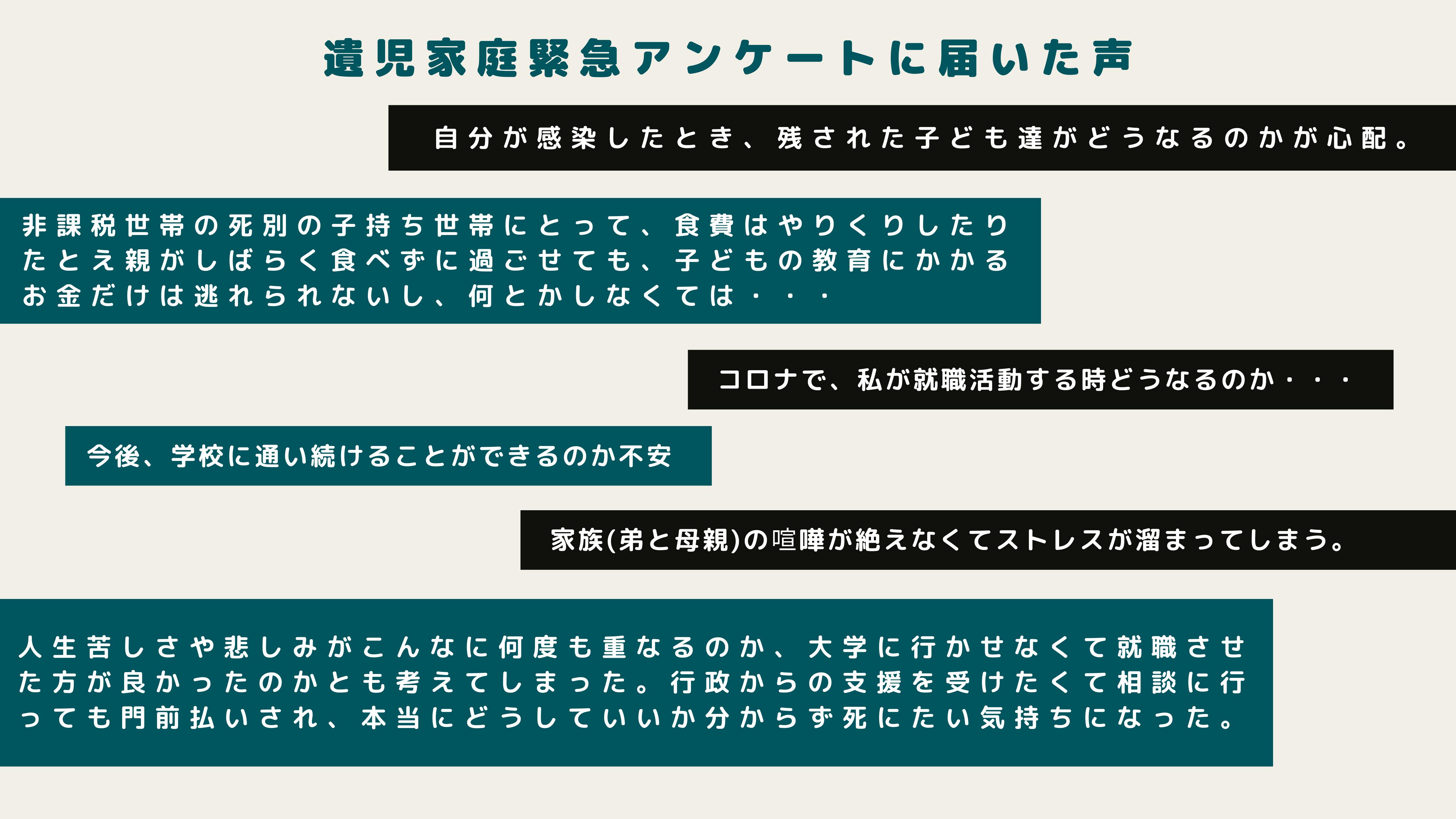 しかし、経済が悪化したり社会の状況が変わったりしたとき、そのしわ寄せは常に社会的に弱い立場にいる者に向かいます。今、この瞬間にも、明日を生きていく希望が持てずに苦しんでいる学生や保護者がいます。