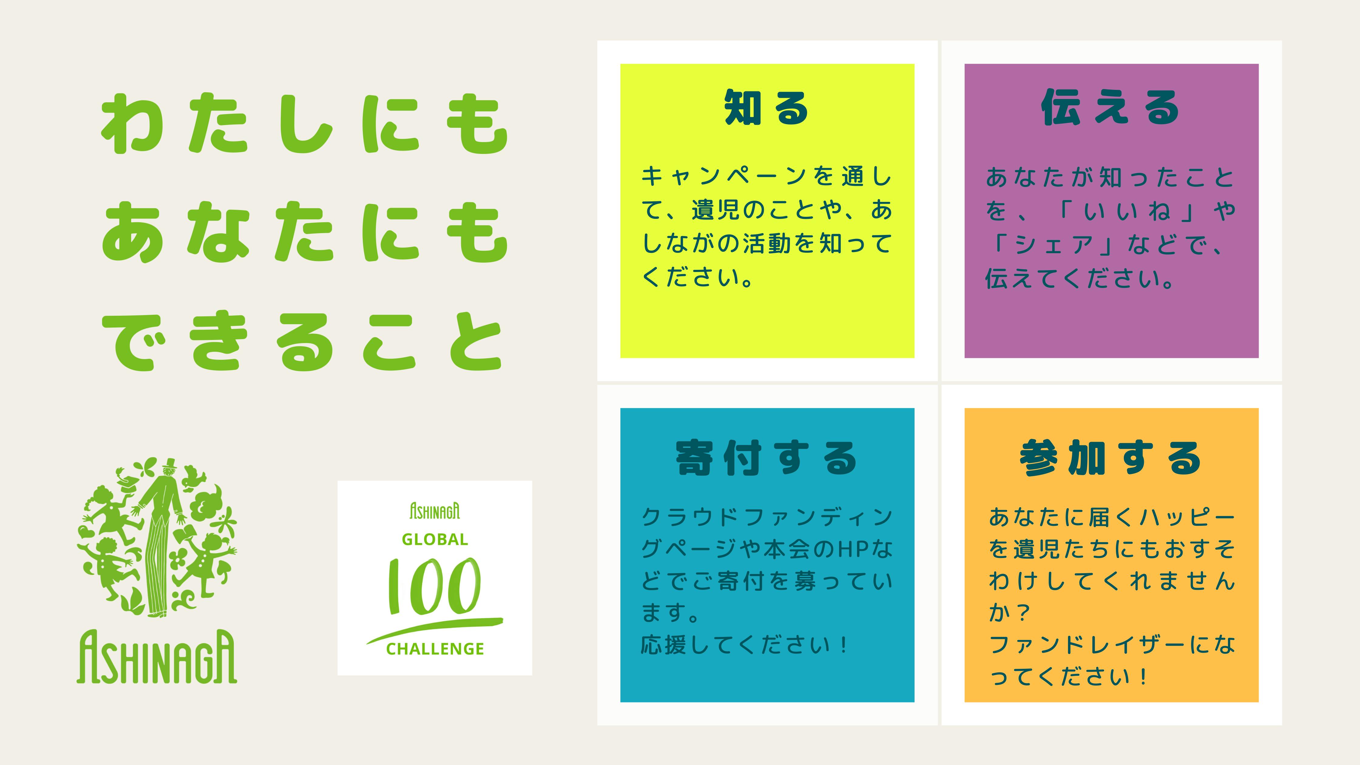 「あしながグローバル100チャレンジ」は、『すべての遺児に教育の機会と心のケアを』というスローガンのもと、世界中から遺児支援のために一緒に活動してくれる100人のファンドレイザーを集め、力を合わせて遺児支援に取り組むための世界的なファンドレイジングキャンペーンです。国内ではあしなが学生募金と連動して100日間のオンラインキャンペーンを実施します。