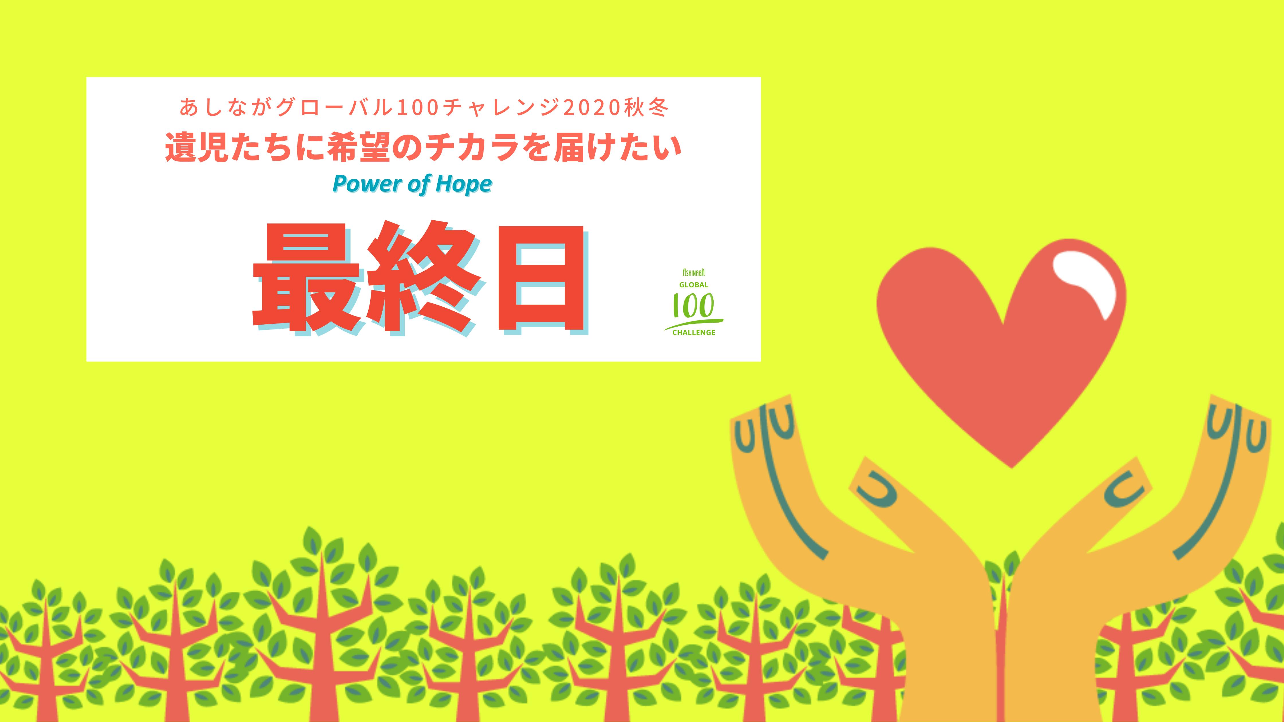 そんな想いで、今回の「あしながグローバル100チャレンジ」での100日間のキャンペーンでは「Power of Hope:遺児たちに希望のチカラを届けたい」をテーマに、さまざまな取り組みにチャレンジすることにしました!