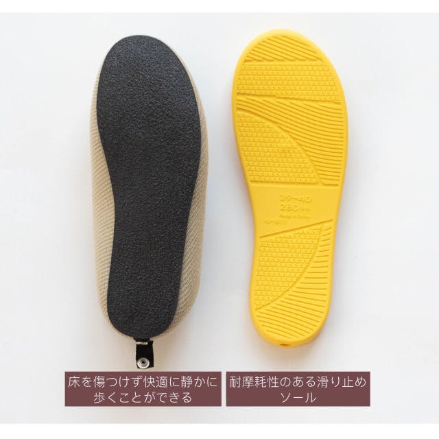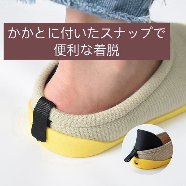 シンプルで機能性と美しさを追求したハイクオリティーなルームシューズです。かかとに付いたスナップでソール部分が着脱可能になり、室内はもちろん、ちょっとしたお出かけにも使用できます。