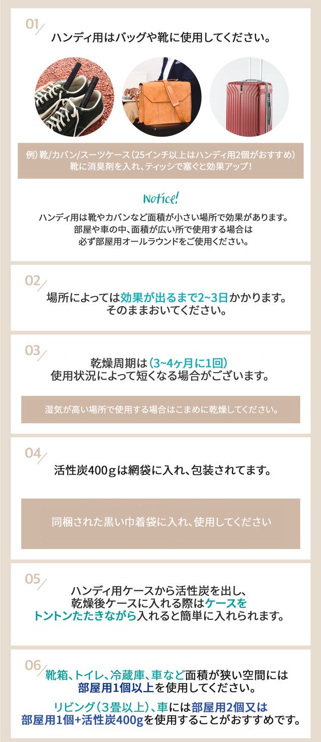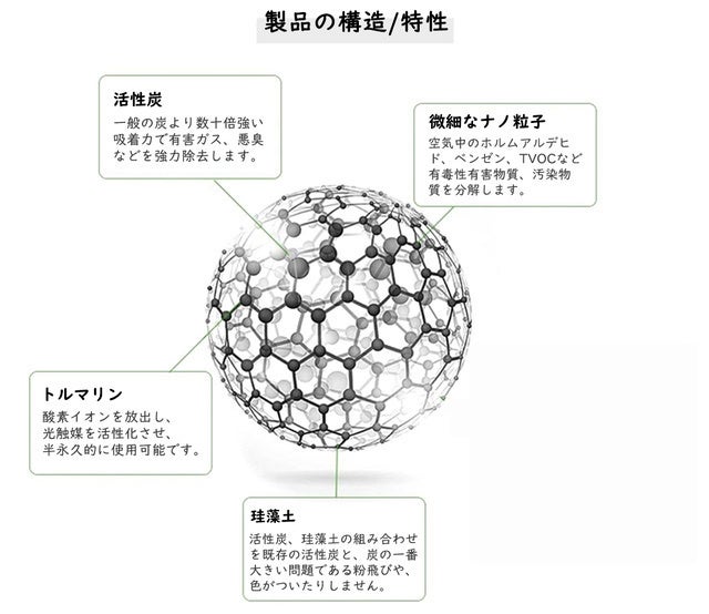 - 自然物質のみを100%使用した活性炭の原料使用で消臭!