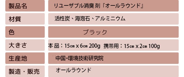 オールラウンドは、ナノバージョンの活性炭で作った再利用が可能な消臭剤です。