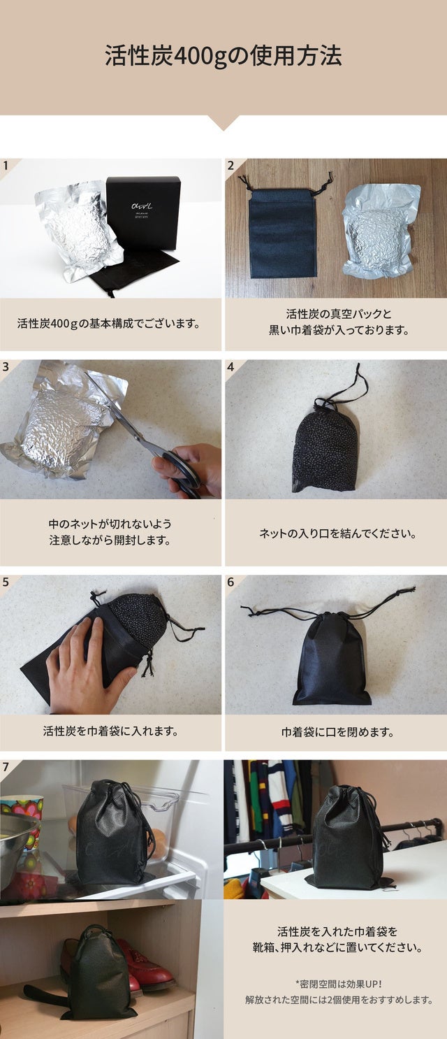 もし使用に応じて臭いがついてしまった場合、活性炭を電子レンジで30秒温めてください。臭いを除去し、新品のように使用可能です。