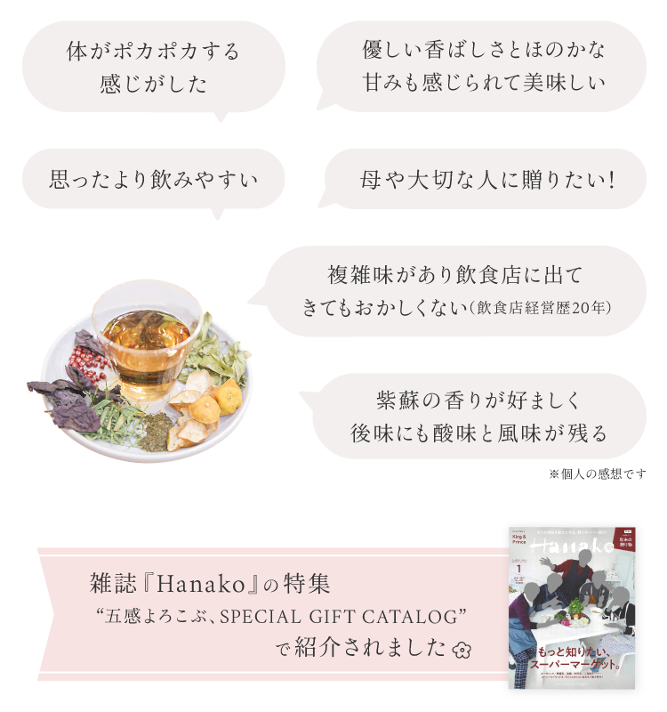 ほうじ茶や小豆茶の深みの中に紫蘇や橘皮、当帰葉がアクセントとなり様々なお味を感じられます。ノンカフェインで飲む人や場面を選ばず、食事にも合わせやすい和のハーブティーです。