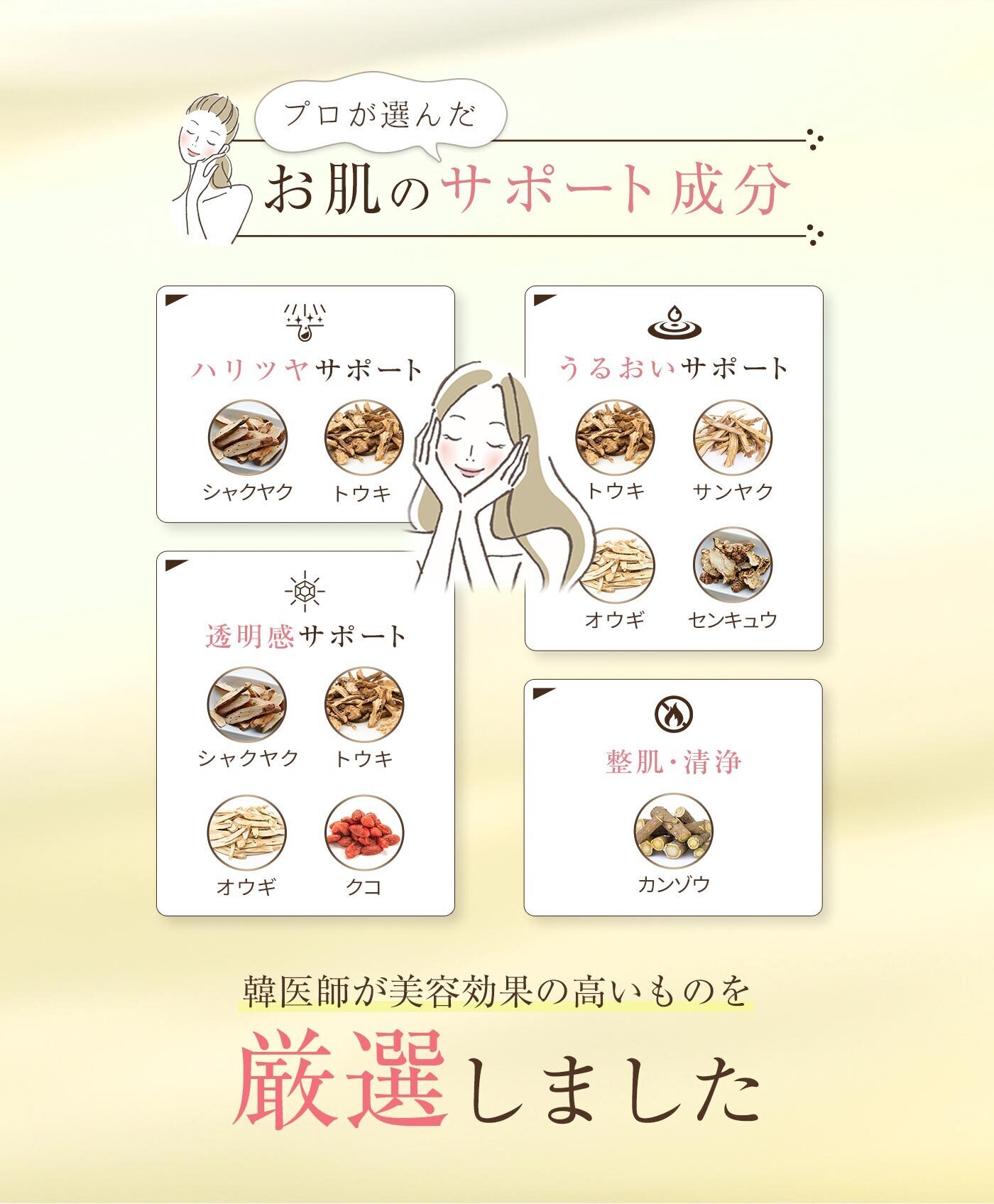 エイジングケアに効果的な7種類の配合和漢(当帰、山薬、センキュウ、芍薬、黄耆、枸杞、甘草)