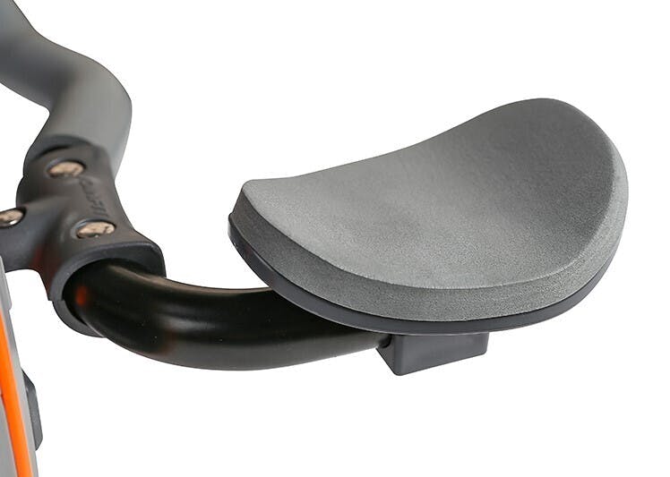 ①ニーパットに膝を乗せ、肘パットに肘を乗せます。ハンドルを握り前方へローラーを転がす準備をします。