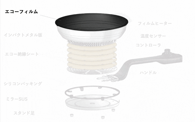 このフィルムヒーターがフライパンの下に装着されることで、薄さと軽さを実現しています。