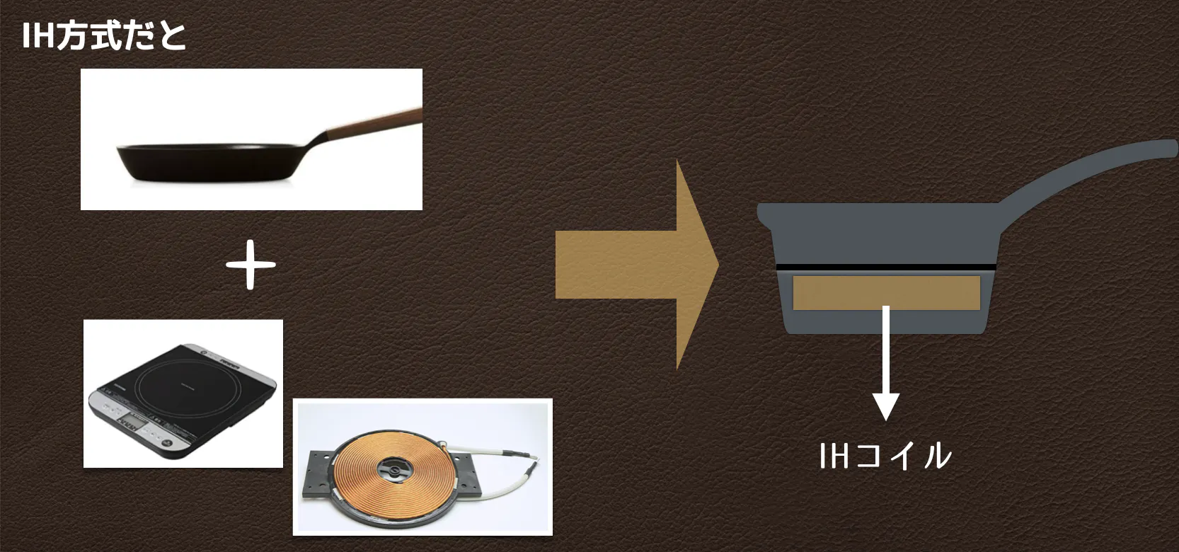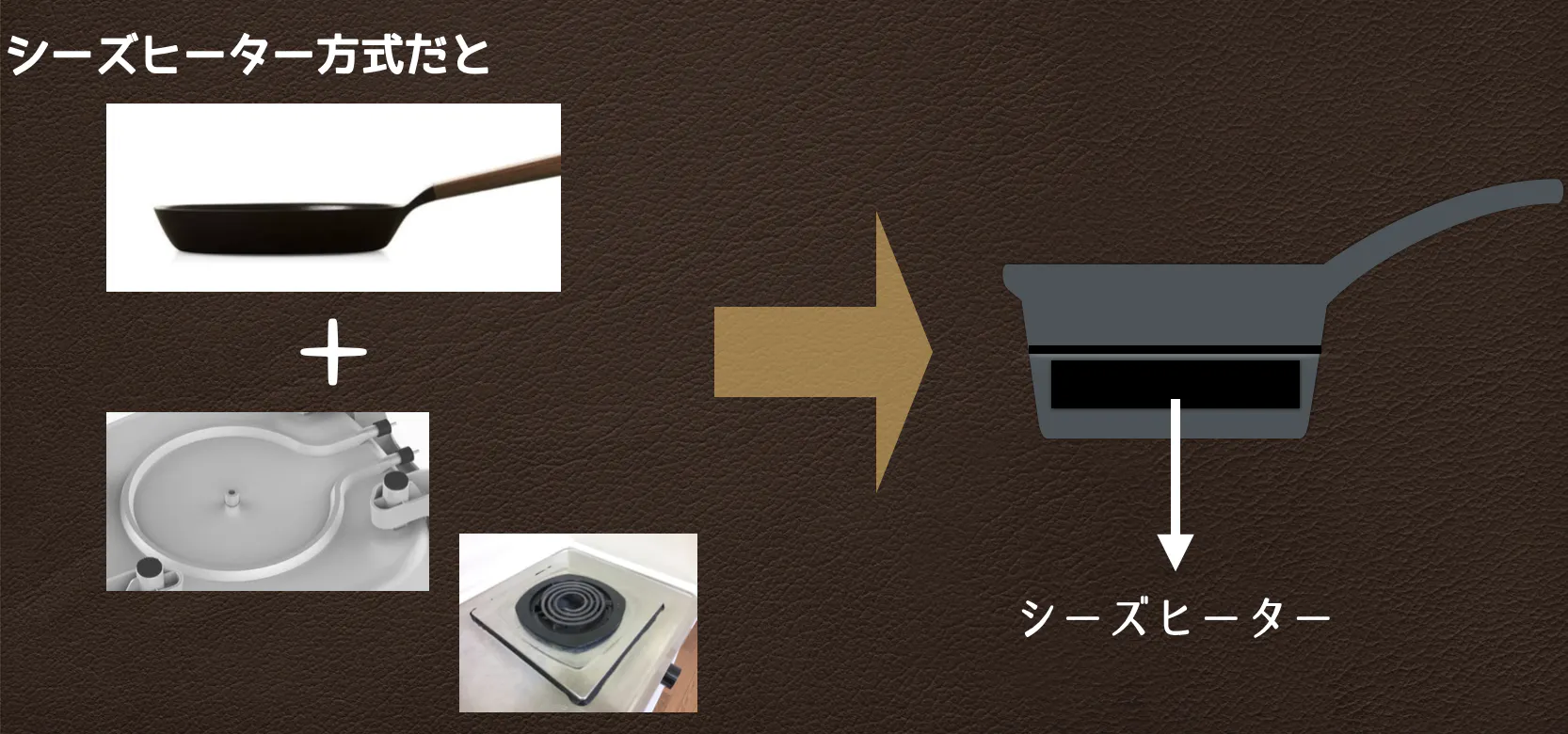従来のホットプレートに使われているヒーターであるシーズヒーター方式やIH方式はヒーター部が大きくフライパンの形状に収まりません。
