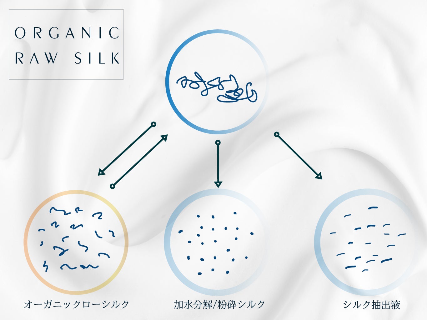今回使用するオーガニックローシルクは、加熱して加水分解シルクとしてシャンプーや化粧品に使用されているシルクとは、全く分子レベルで異なります。