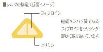 繊維タンパク質であるフィブロインをセリシンが層状に取り巻いています。