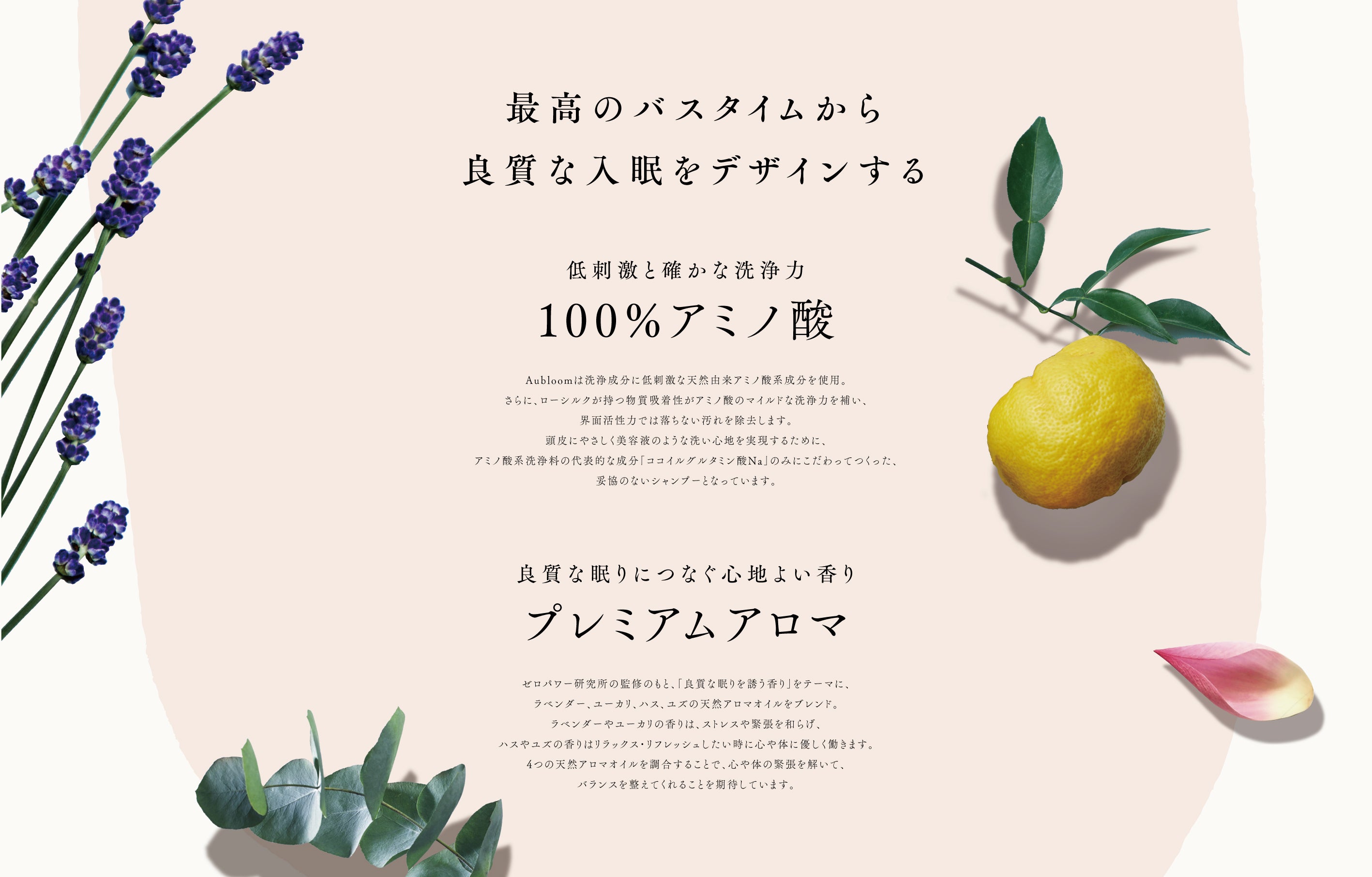 今回のシャンプーでは、バスタイムのリラクゼーションをテーマに4つの植物精油を配合しました。