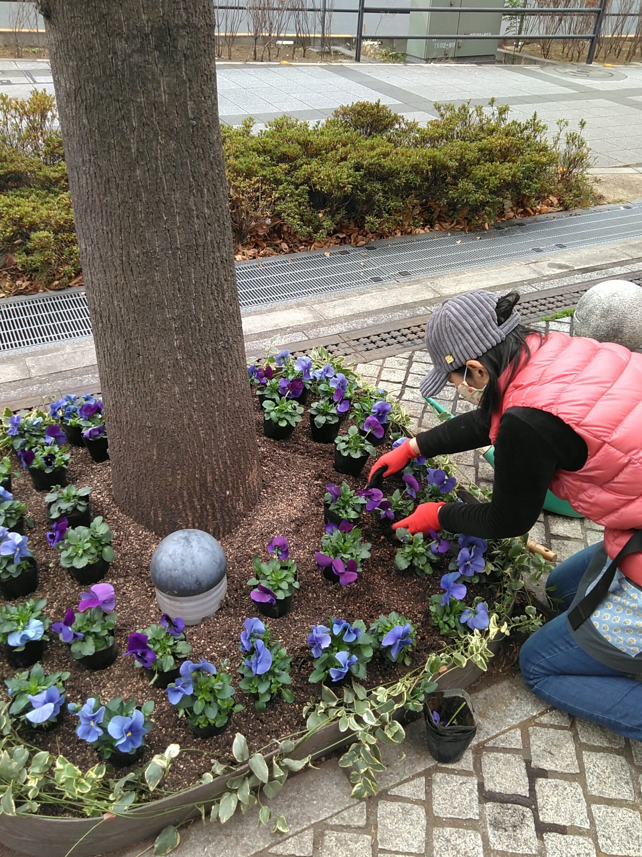 豊洲の花壇ボランティアグループの方々が寒い中、みなさんで植え込み作業をした様子です。