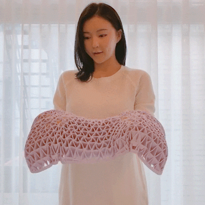 最終的に高さ調節ができるよう3Dエアメッシュを3段に製作し、プロトタイプができあがりました。テスターからのフィードバックを総合的に検討したところ、TPEの柔らかさとしなやかさが、エアメッシュにより相殺されてしまうという意見が多かったため再度第2の素材を見直すことに。