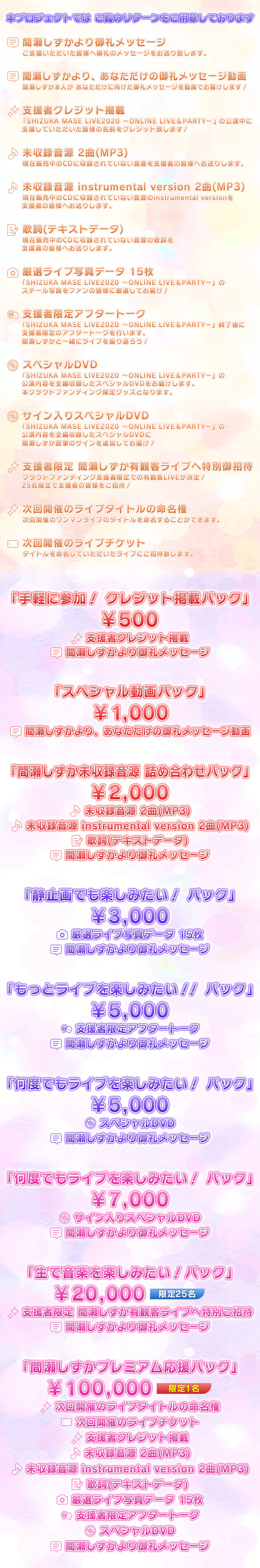 間瀬しずか初の大型有料配信ライブ「SHIZUKA MASE LIVE2020 ~ONLINE LIVE&PARTY~」の運営費・制作費を賄うため行う今回のクラウドファンディング。