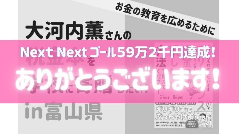 2021年5月5日に無事クラウドファンディングが終了しました!NextNextゴール59万2千円も達成し、61万4500円もの支援が集まりました!終了直前のご支援もあり、最後まで嬉しい次第でした。富山県の公立小・中・高全部に加え、私立高校、大学全てに配ることができる金額が集まりました!!先ほど、出版社さんへ250冊の発注の連絡を終えました。これからは、リターンメールをお一人ずつお送りしていきます。時間がかかりますが、ご了承下さい。本が届きましたら、皆さんの寄贈名を記載していきますね^^これから随時ご報告もしてきます。改めてご協力頂いた皆さんに、心から感謝を申し上げます。富山の子供たちにお金の教育を広めるため、しっかり本を届けて来ます!!