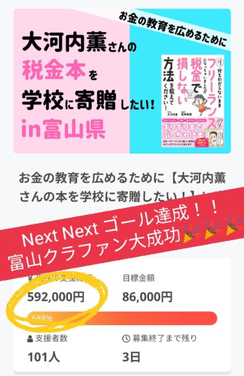 募集終了3日前にして【Next Next ゴール59万2千円】を達成しました!