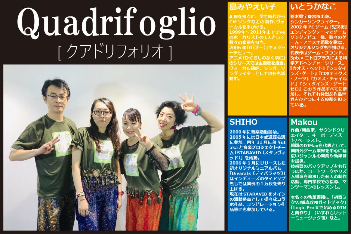 中には、「ひぐらしのなく頃に」の主題歌の歌唱で有名な、「島みやえい子さん」や、数多くのゲーム主題歌を歌唱している「薬師るりさん」による作詞作曲楽曲もございます。