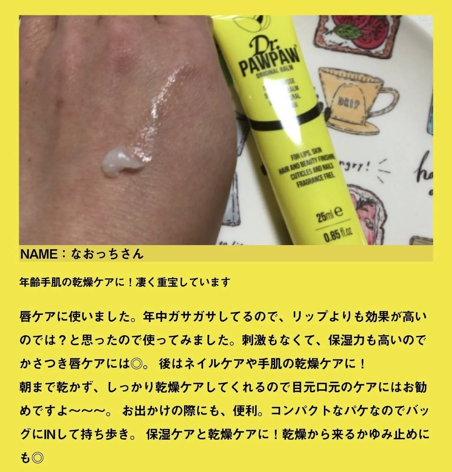 約3年前にイタリア ボローニャで開催された世界最大の美容の展示会で、Dr.PAWPAW社のJohnnyとPaulineに会ってご夫婦の人柄に触れたのがきっかけです。オーストラリア出身のPaulineは、生まれたときからポーポー(パパイヤ果実エキス)が入ったバームを使っていましたが、Johnnyと結婚して、イギリスに住むようになり、イギリスでポーポー入りのバームが売ってないことに驚き、全くの畑違いでしたが、失敗を重ねながらも、2年の歳月をかけて、ドクターポーポーを開発しました。
