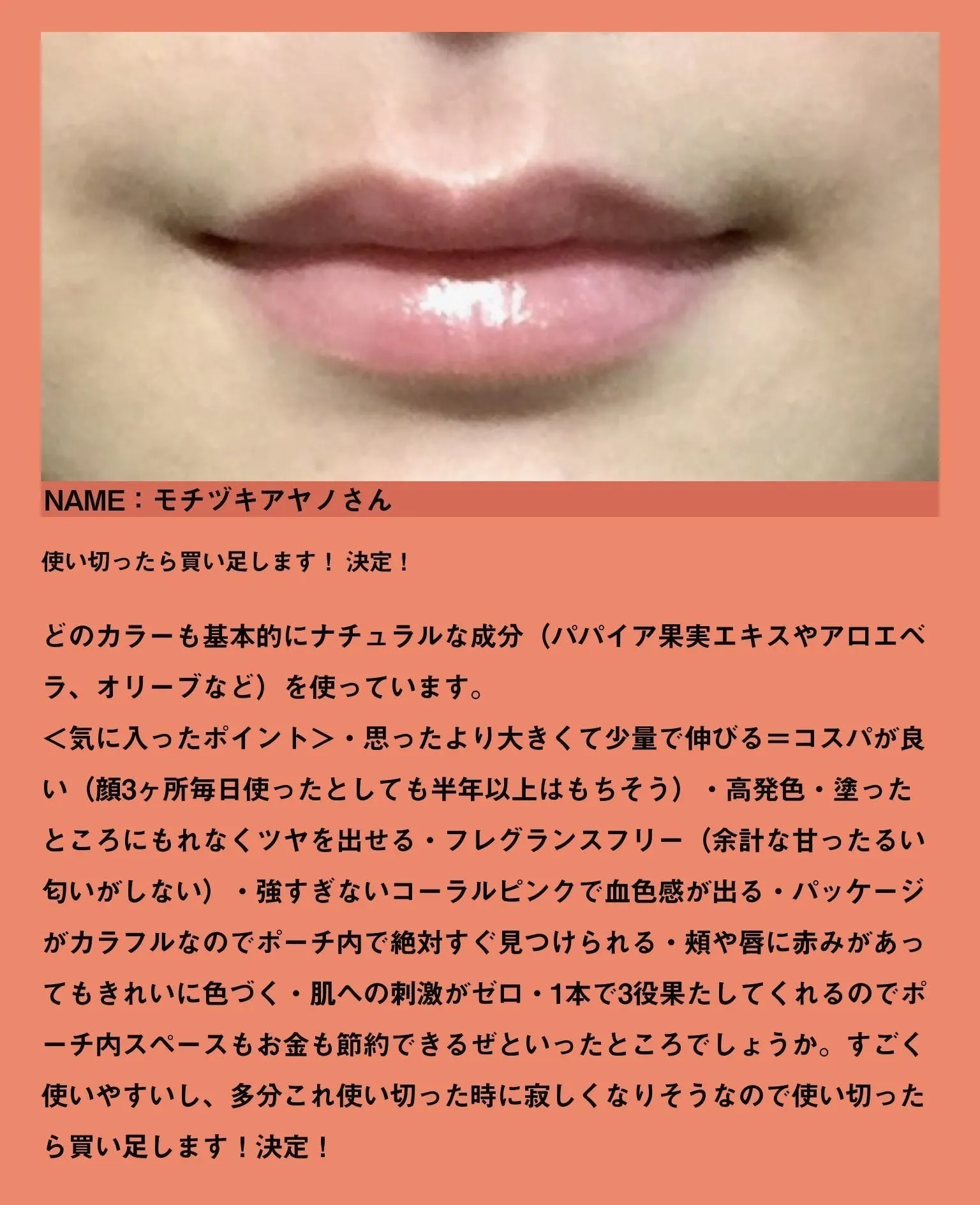 唇に淡い色調と潤いを与えます。頬とまぶたにも自然な輝きを加え、美しい仕上がりになります。リップ、チークとして、または、まぶたにひと塗りでゴージャスな輝きを演出し、さらっとした仕上がりに。さまざまな人の肌の色によく合い、自然な色合いを作り出すことができます。