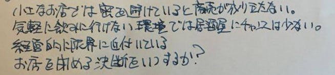 そのため営業席数は半減し、恥を忍んで申し上げると満席を頂いたときでもその売上は以前の半分という状況です。