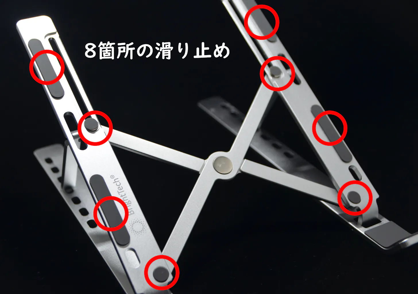 滑り止めのゴムはスタンドの上下だけではなく、可動域も含めた計8箇所に配置。