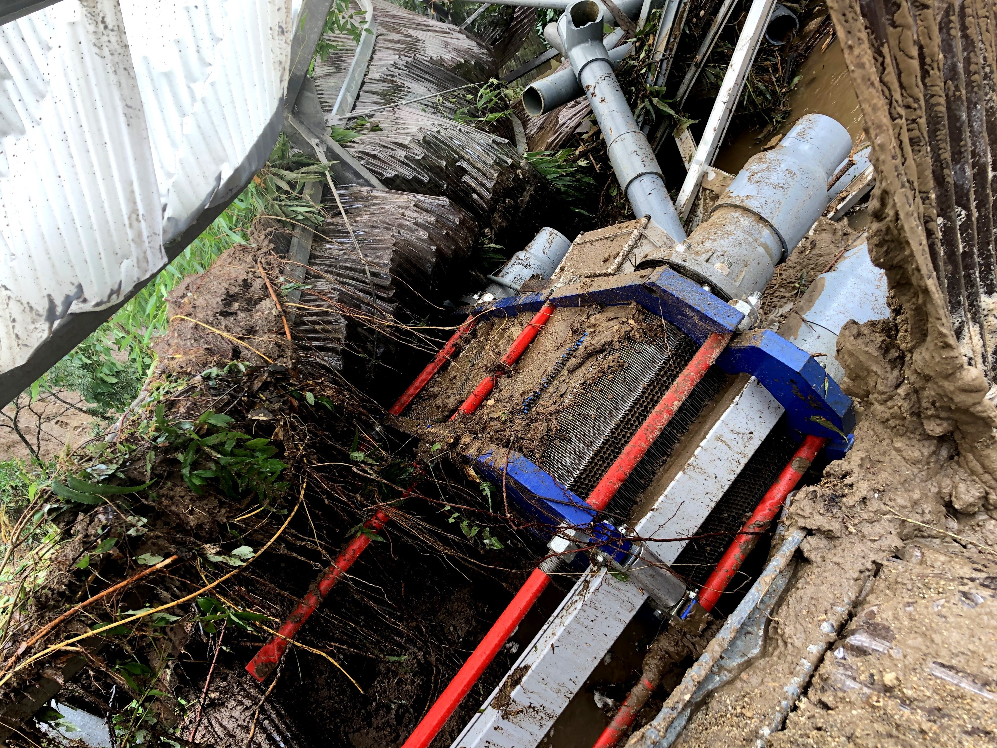 用水路は、崩れ落ちた倒木や土砂で埋まり、ポンプがなぎ倒されていました。