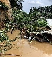 降り続く雨の中、午前9時過ぎの作業中に、養殖池横の山が土砂崩れを起こし、山肌が一気に崩れ落ちたのです。