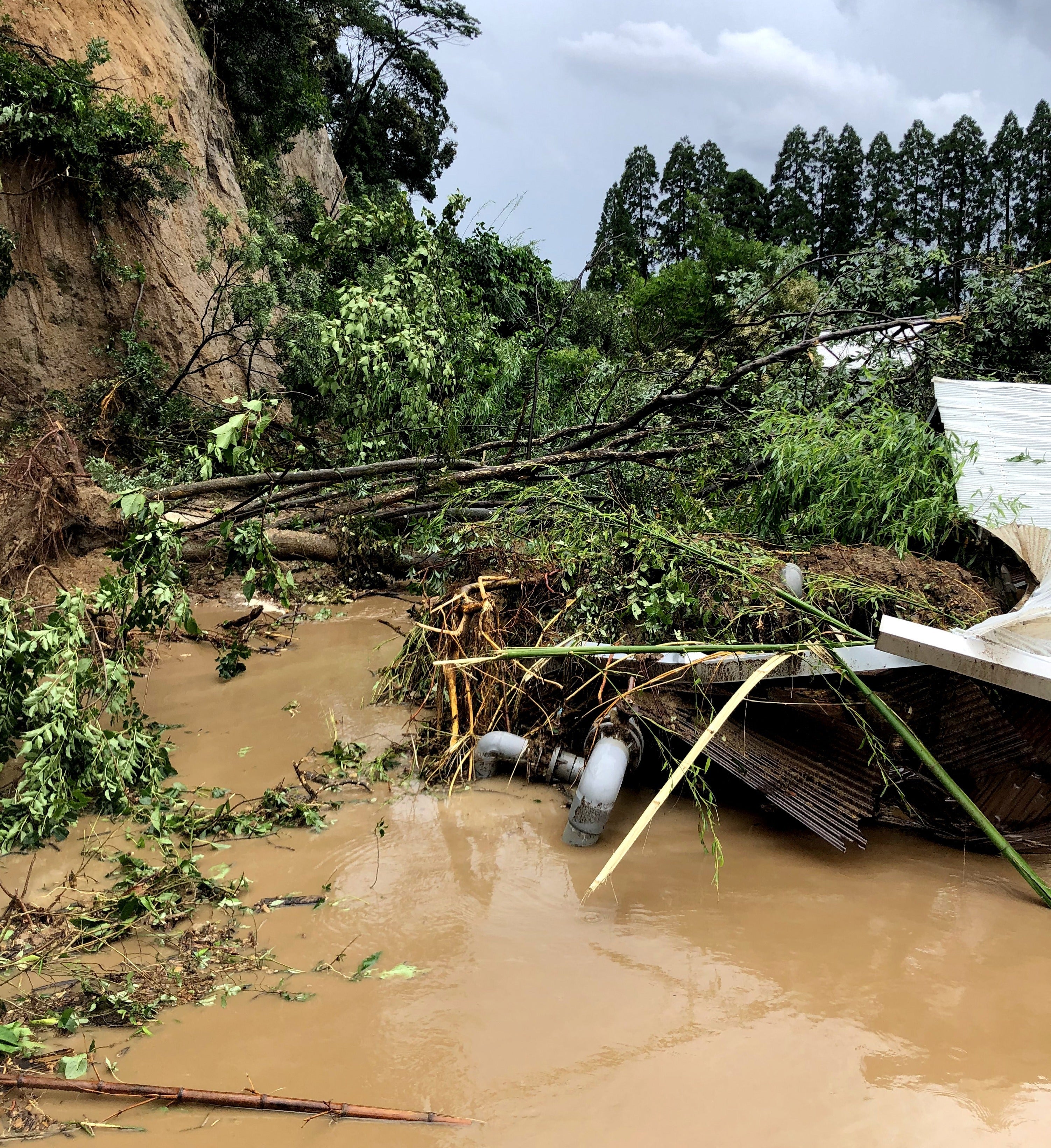 降り続く雨の中、午前9時過ぎの作業中に、養殖池横の山が土砂崩れを起こし、山肌が一気に崩れ落ちたのです。