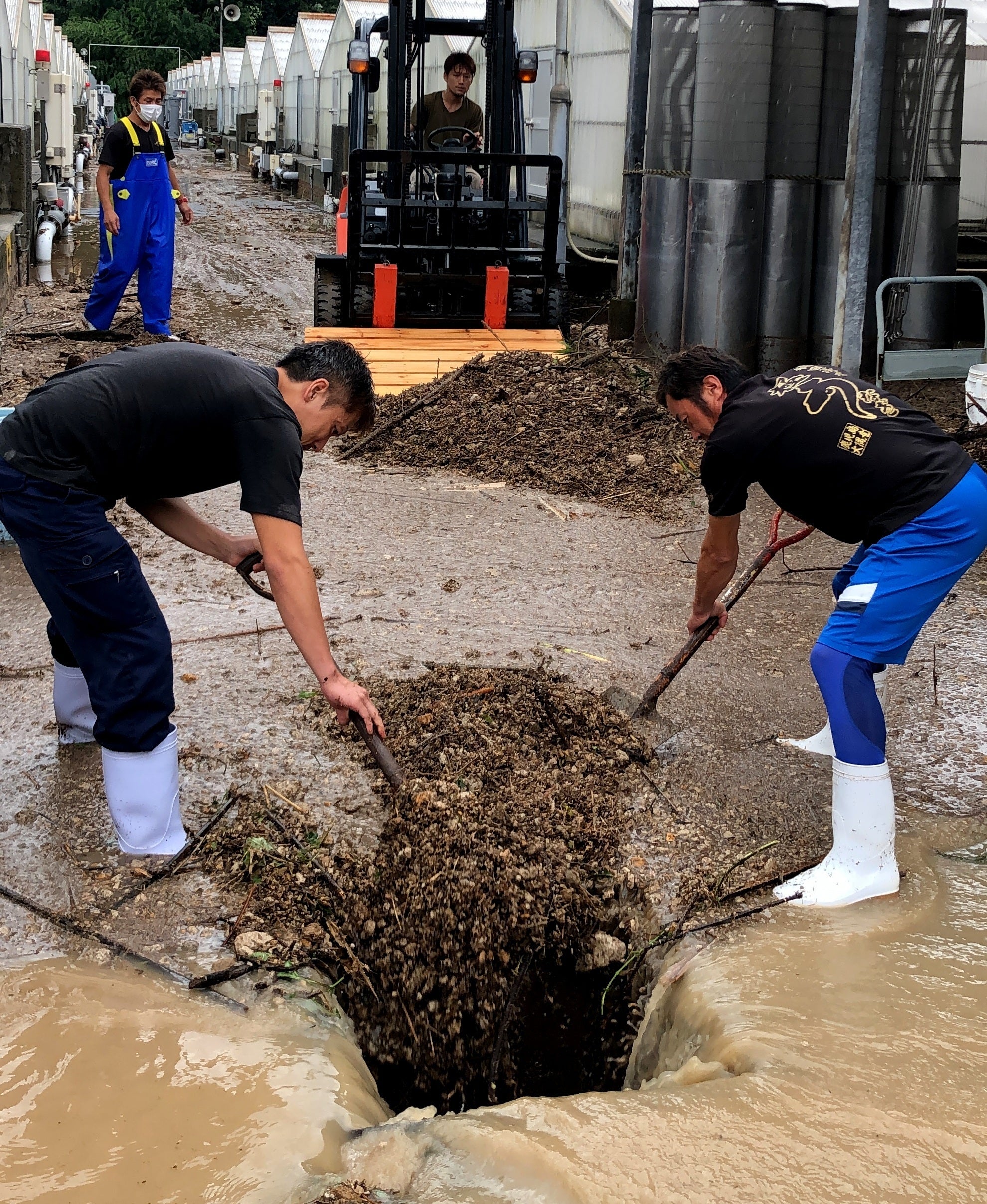 水害当日は出荷できないかもしれない・・・と絶望的な気持ちで出荷先にも連絡しましたが、プールのような養殖池一棟一棟の泥を掻き出し、きれいに清掃しているうち、なんとかできるかもしれないという思いになってきました。