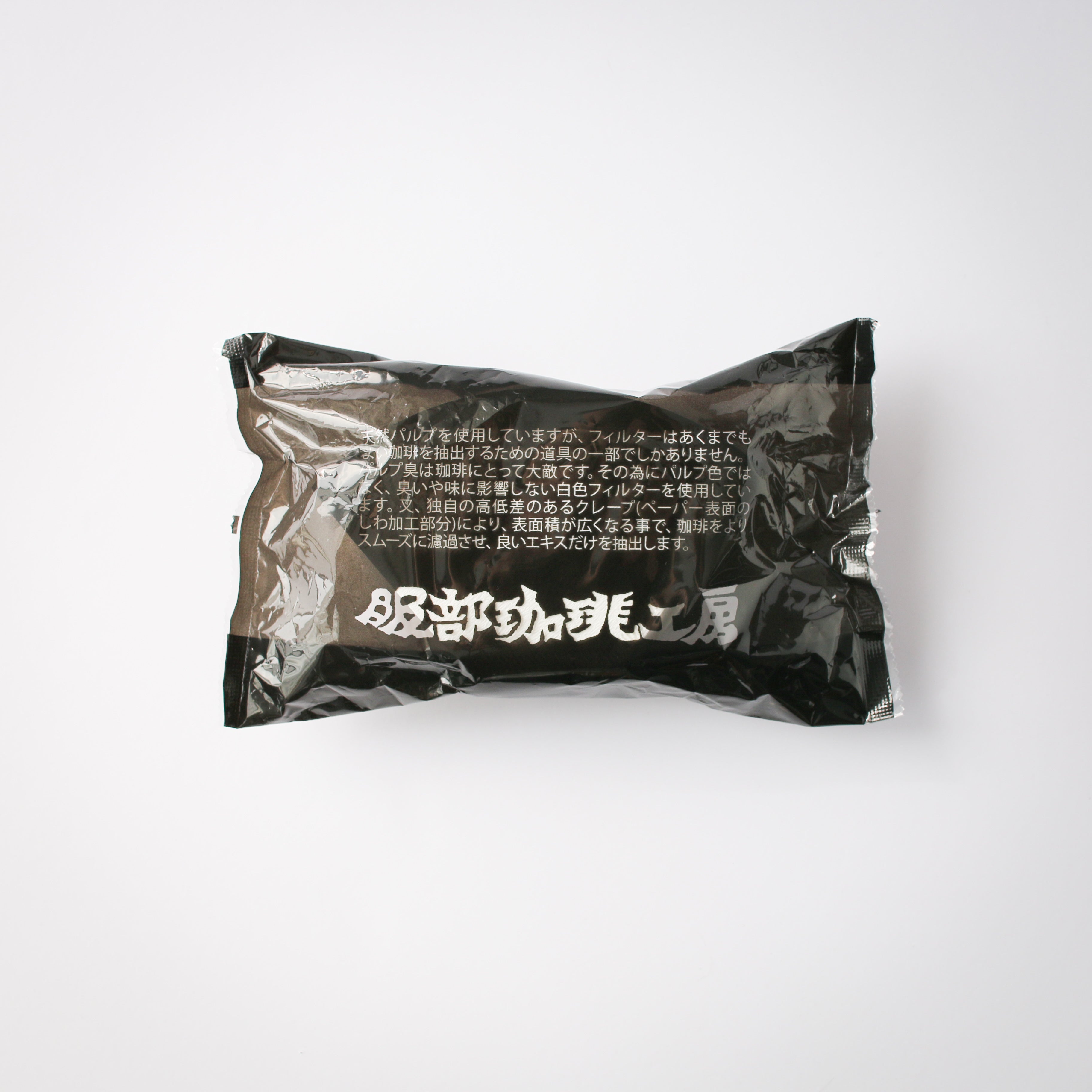 珈琲フィルター:天然パルプを使用していますが、フィルターはあくまでもよい珈琲を抽出するための道具の一部でしかありません。パルプ臭は珈琲にとって大敵です。その為にパルプ色ではなく、臭いや味に影響しない白色フィルターを使用しています。又、独自の高低差のあるクレープ(ペーパー表面のしわ加工部分)により、表面積が広くなる事で、珈琲をよりスムーズに濾過させ、良いエキスだけを抽出します。