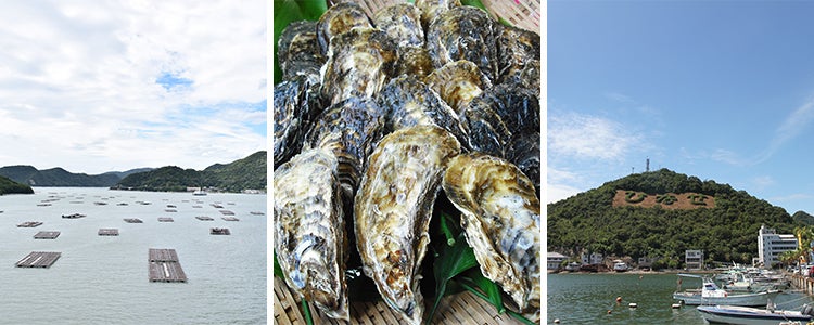 牡蠣棚と殻付き牡蠣、日生の街並み