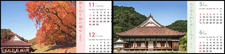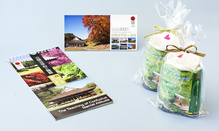 「旧閑谷学校と論語」の魅力を知っていただく為の商品として、「ポストカードになる卓上カレンダー」を商品化致しました。この商品は四季折々の旧閑谷学校美しい景観の魅力を最大限に活かした写真と、この地で多くの先達が学んでこられた論語の章句を1つにまとめ、日々の私たちの生活を明るく、心豊かに照らす一助となればと思い制作いたしました。