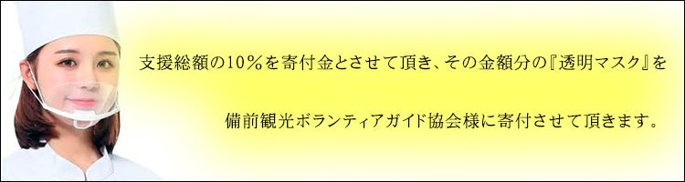 今回のクラウドファンディングへの挑戦ですが、皆様から頂く支援総額の10%を備前観光ボランティアガイド協会様に寄付金とさせて頂き、その金額分の『透明マスク』をお送りさせて頂きます。