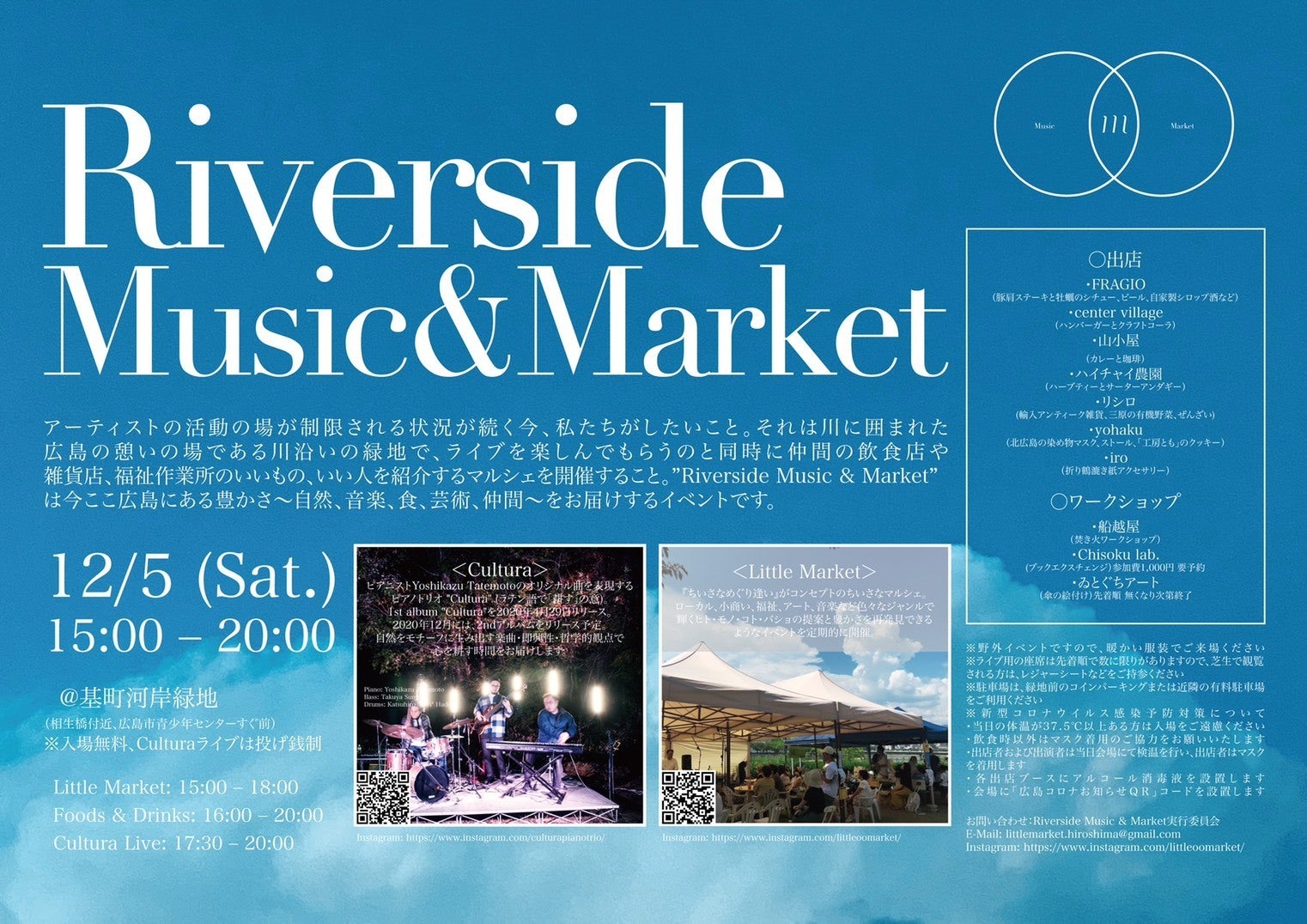 活動の場、表現の場、販売の場が引き続き制限されているこの状況で、今私たちができること、したいことは、「変わらずにここにある素晴らしいもの」を「新しい生活様式」に沿った形で届けていくこと。 今回、ピアノトリオ Cultura が新しいアルバムを発売するにあたり、川に囲まれた町、広島の憩いの場である川沿いの緑地でアルバムリリース記念ライブをを楽しんでもらうのと同時に、仲間の飲食店や雑貨店、福祉作業所のいいもの、いい人を紹介するマルシェ "Little Market" を共同開催することを企画しました。