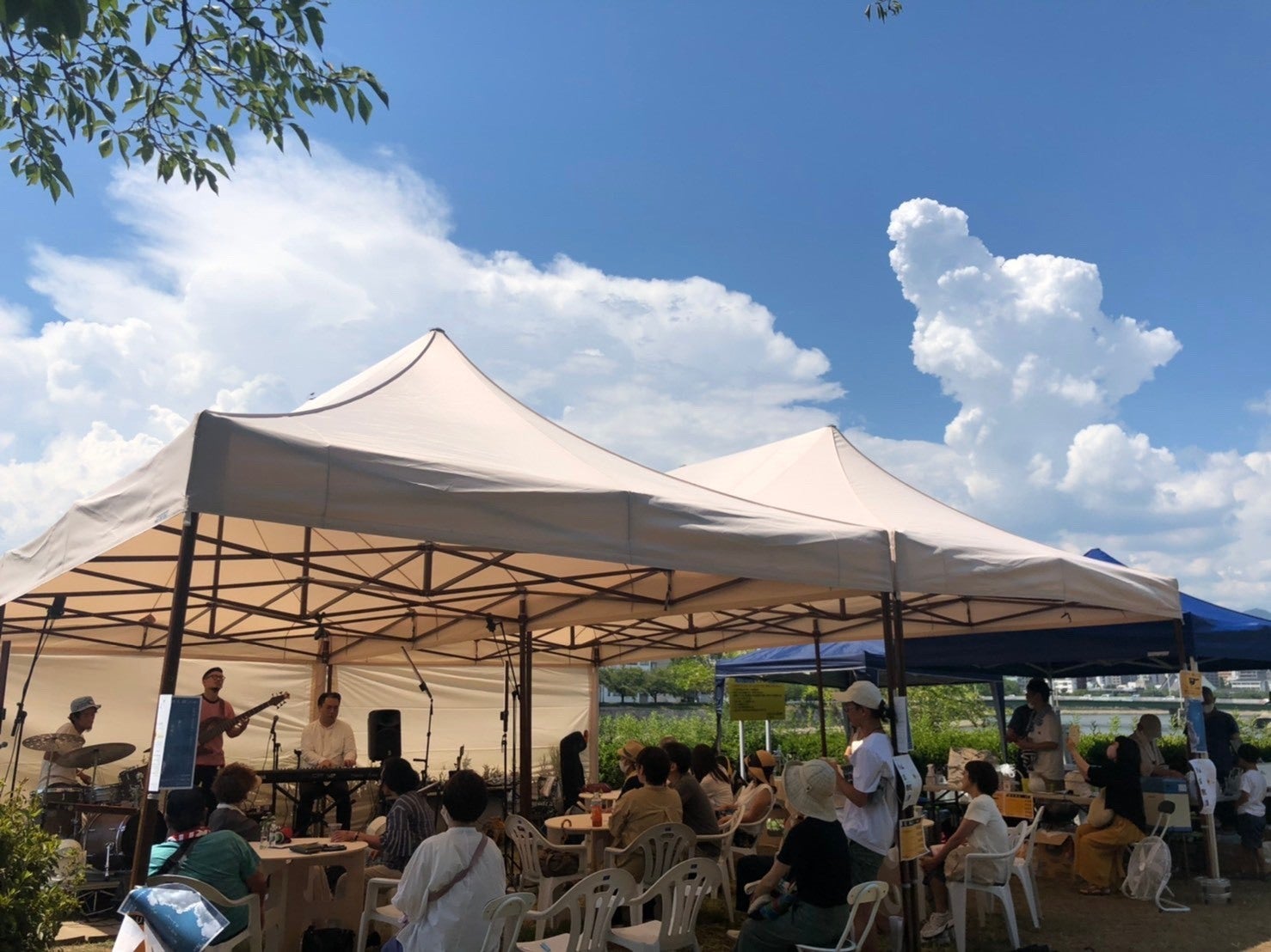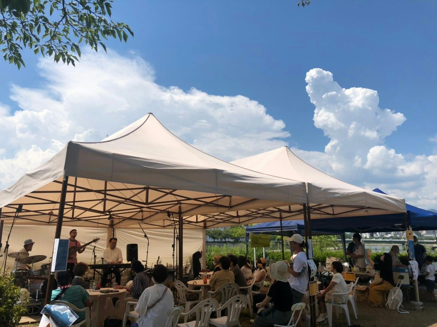 川沿いの緑地という人々に開かれた公共スペースでの開催ということや、多くの方に気軽に音楽を楽しんでいただきたいという思いから、今回Culturaのアルバムリリースライブは入場無料の投げ銭制にしました。