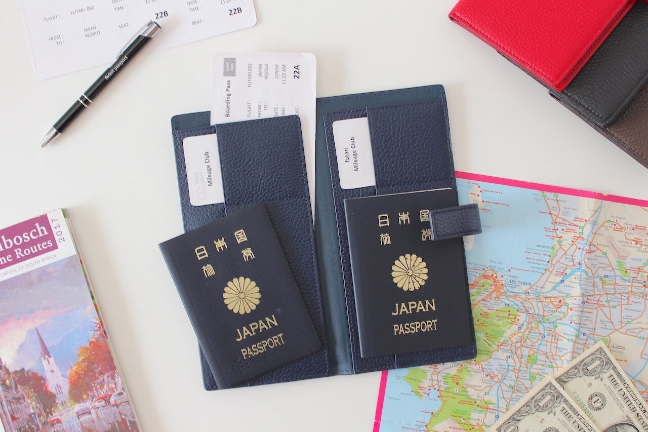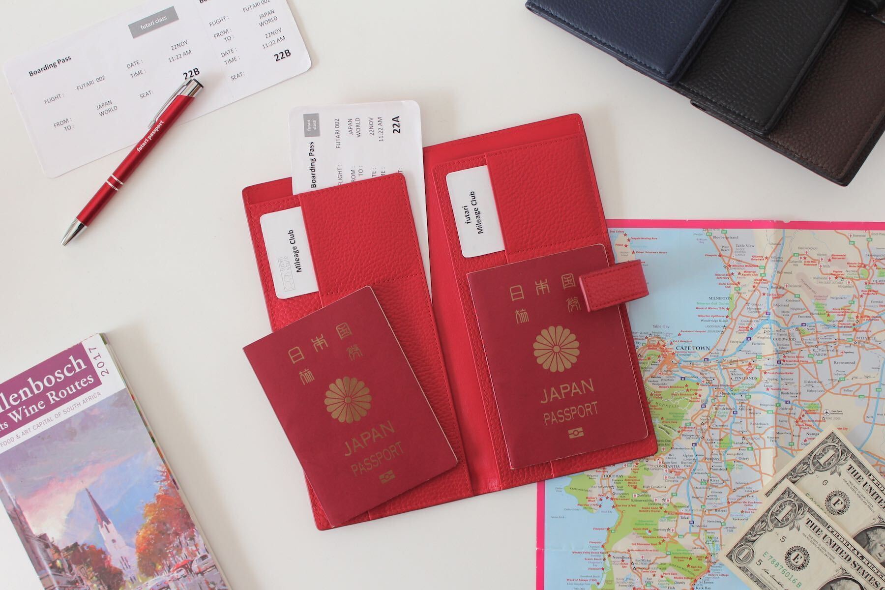 futari passportは、二人分のパスポート・搭乗券・カード類などあらゆる渡航書類一式をひとつにまとめて収納できます。
