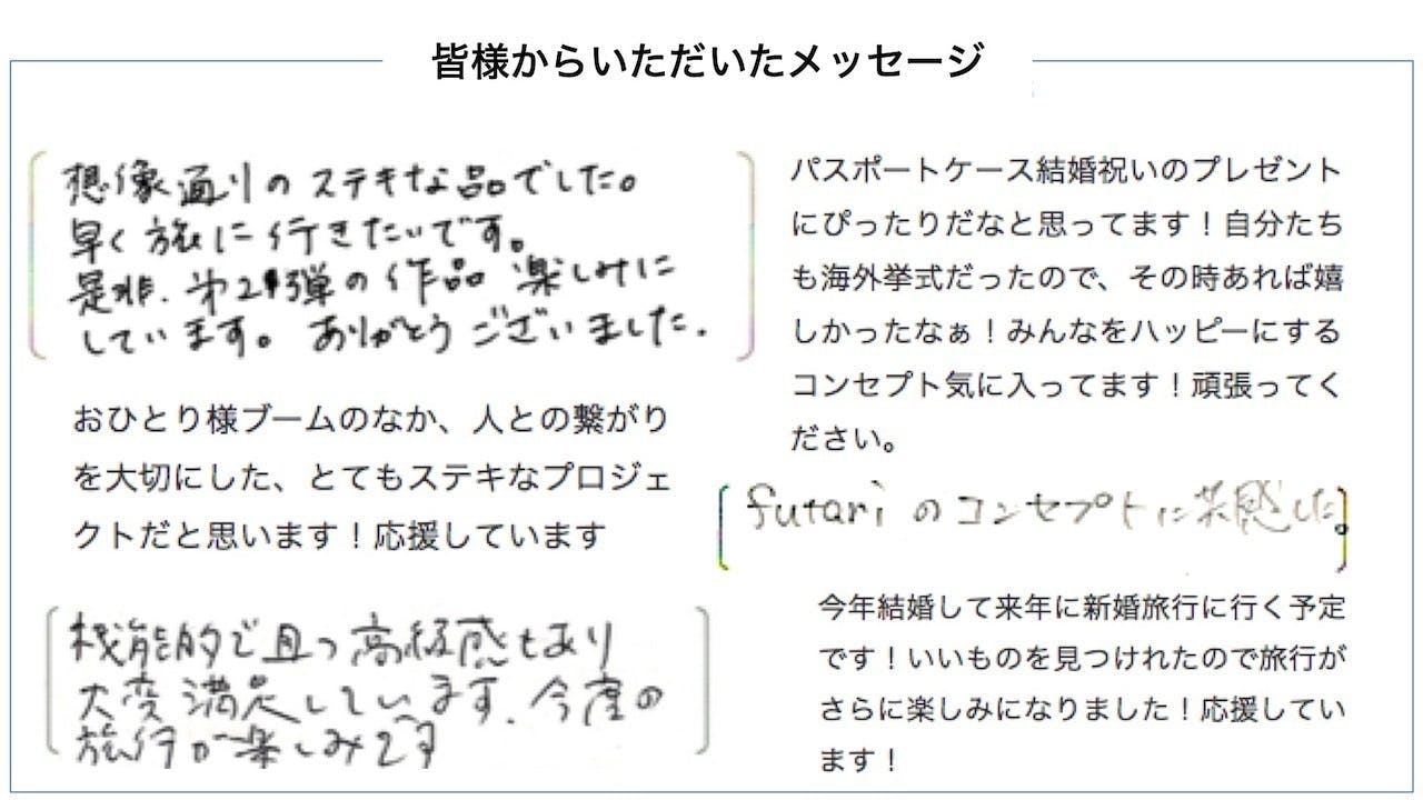 2020/12/22 21:17ご支援者の皆様お世話になっております。本日全てのご支援者様へリターンを発送して参りました。クロネコヤマト宅急便にて発送しまして、お届けは明日12月23日の予定になっております。配送状況や商品についてなど何かございましたら、お気軽にお知らせくださいませ。取り急ぎ、発送報告のご連絡ではございますが、引き続きどうぞよろしくお願い致します。futari style チーム一同 もっと見る【futari passport】御礼
