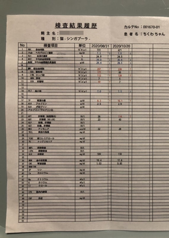 10/20の血液検査の結果です。貧血気味で、蛋白質の中でも、グロブリンの数値が高めです。