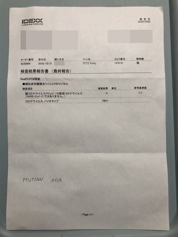検査結果の最終報告は猫コロナウイルスバイオタイプ(ドライタイプ)陽性「FIP」とのことでした。