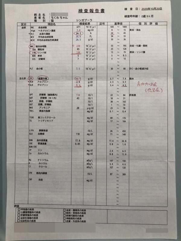 しかし、先週辺りから、血便や下痢、嘔吐、結膜炎が一向に収まらず、一日中寝ていることが増えたので、さらに病院に連れていき、お医者様の判断のもと血液検査を行いました。その結果、血液にとある異常な数値が検出されました。