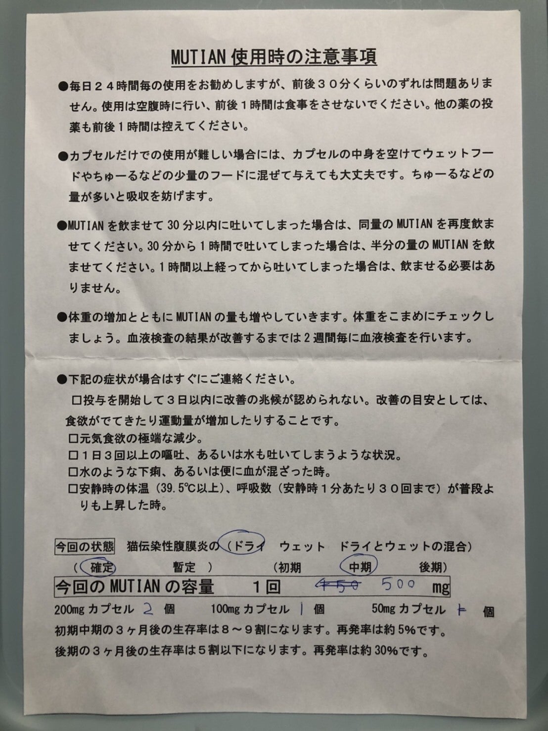 Mutianは原則12週間連続投与が絶対条件であり、2週間に1回行う体重計測と検査の結果によって、投薬する量が変わっていきます。また途中で中断したりすると、1週目からやり直しになってしまいます。そして12週間の投薬が終了したのち、血液検査等の結果で正常値を保つことが出来ていると、FIPが再発しにくくなり、完治という事になります。