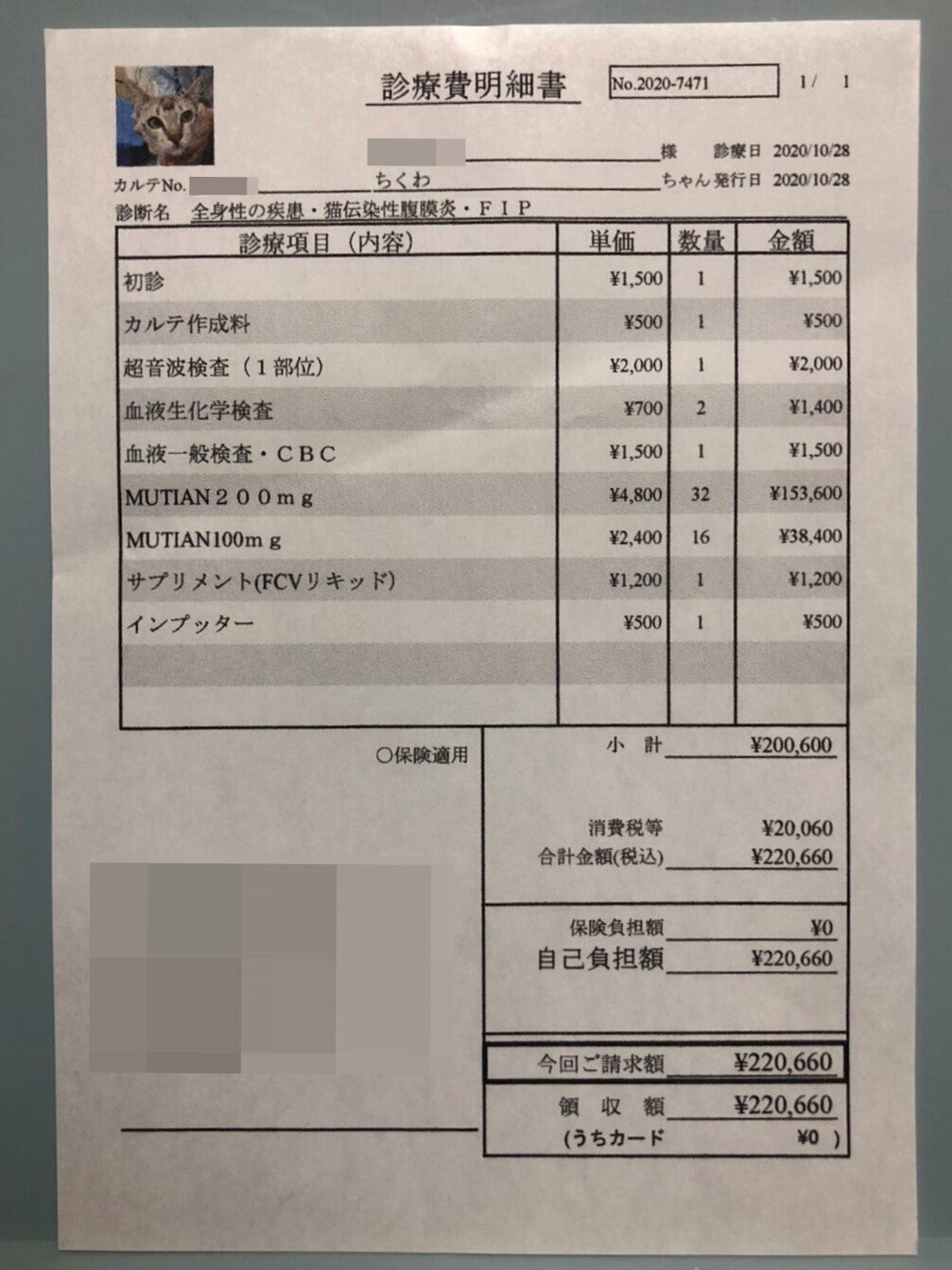 また、ちくわはFIPの中でもドライタイプで、新薬の量と値段は1.5倍に跳ね上がります。飼い主なのであればそれくらい責任持って前々から準備するべきだったのではないか、と思う方もいるかもしれませんが、ちくわを迎え入れてまさか5ヶ月程でFIPという不治の病を発症するとは思っていませんでした…。しかし、今回このFIPの治療費は、私達の想像を遥かに超える金額でした…。