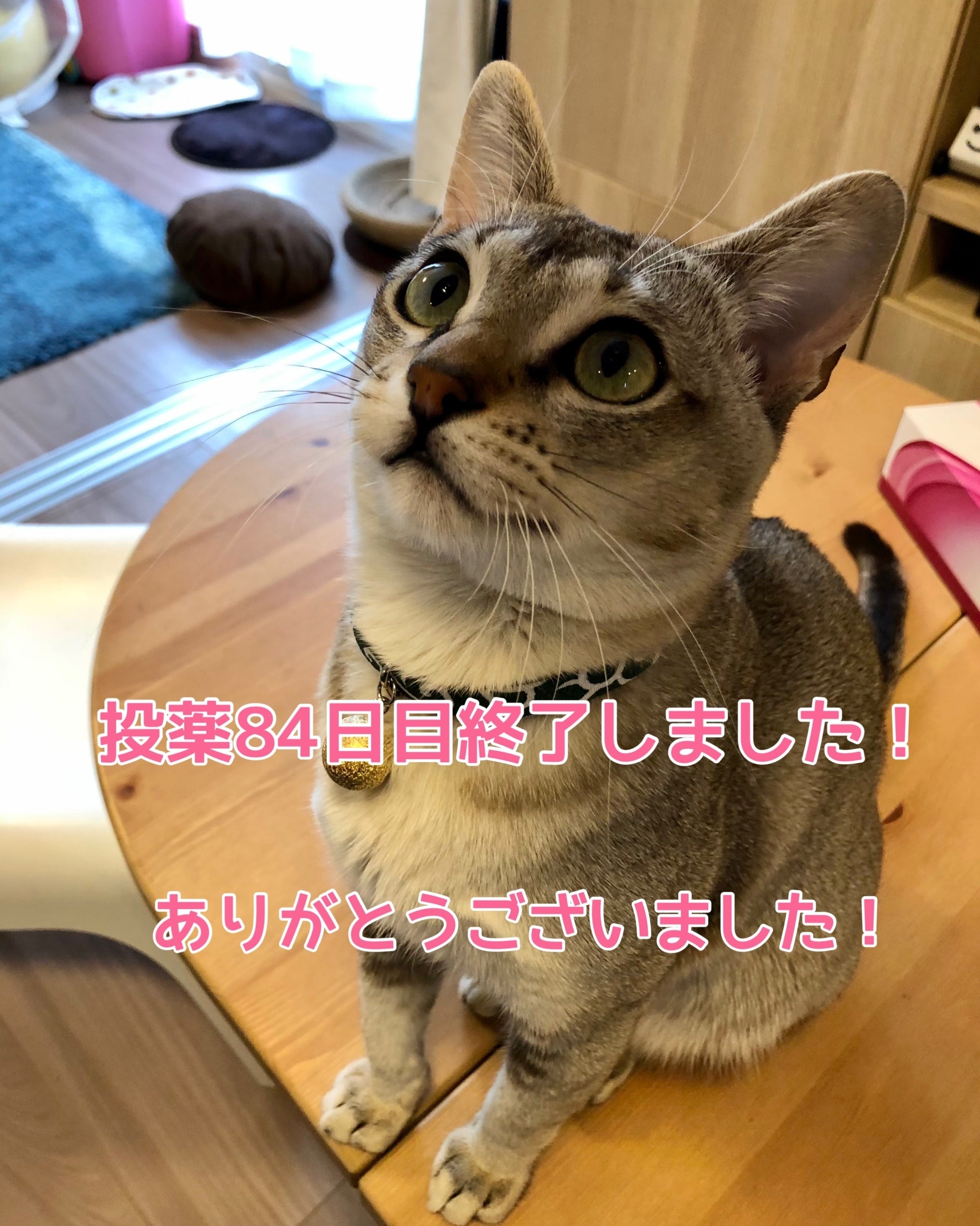 こんばんは(*´-`)投薬84日目無事終了致しました!最初は失敗ばかりでちくわの口も私の手もMUTIAN色に染まったり....お薬が口の中で割れてしまい、味がまずかったか、ちくわが吐いてしまったりと....もうハプニングの連続で、こんな事を80日以上続けられるのか...と凄く不安になったのを覚えています。でもちくわは段々お薬を飲むのが上手になり、私も慣れて今は投薬器のスペシャリストか、、と思うぐらいスムーズになりました(*´-`)今日は余っている50ミリや100ミリも消化するためお薬が8粒でしたが、1粒も失敗しなかったです(^ ^)またちくわは悟った表情でした...ちくわ、84日間頑張ったねー( ; ; )ここまで来られたのも、ご支援、ご協力頂いている皆様のお陰です!本当に、本当にありがとうございましたm(_ _)m私ごとですが、少し寝不足が酷いのか今日寝坊してしまって...でも息子がまたちくわにご飯をあげていてくれました( ; ; )「息子にも今日でお薬終わるよ!ちくわ元気になってるね。多分どんどん元気になるよ!」と伝えています!「でも、お薬が終わってからちゃんとちくわのこと見てあげないと、しばらくはまた病気になってしまうかもしれないから、元気が無かったらすぐに教えてね!」とも伝えました。明日から経過観察が始まります!また更新して行きますので宜しくお願い致します(*^^*)
