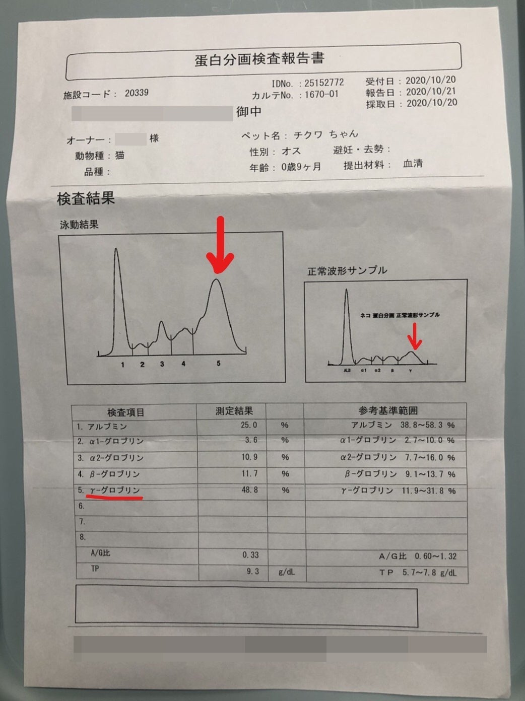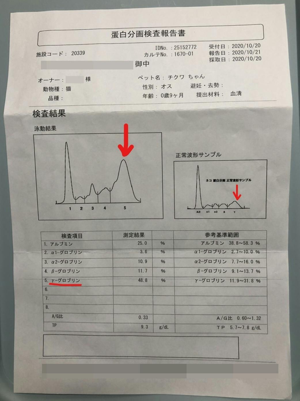 そして、お医者様からは「命にかかわる病気であるFIP(猫伝染性腹膜炎)の可能性があります。」と言われ、すぐにFIPであるかどうかを調べるため、さらに精密な検査である血液の蛋白分画検査をお願いしました。