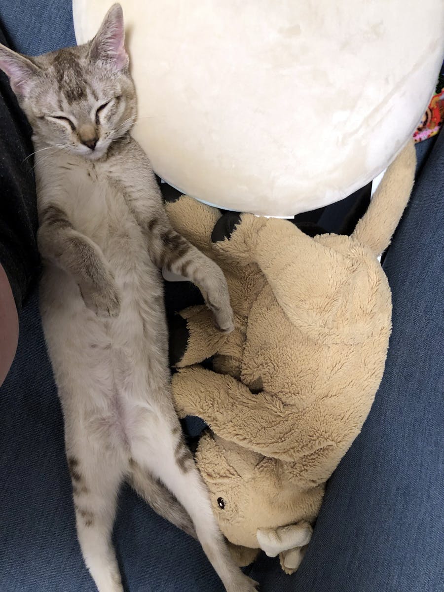 2021/04/24 09:17おはようございます!ちくわはとっても元気です\(^-^)/1回吐いてしまったことがありましたが、少量でそれ以来食欲があり元気なので大丈夫そうです。耳のカビはお薬を毎日すりすり塗っていたら良くなってきました!最初はカビ?(゚ω゚)!と驚きましたが、猫ちゃんでは珍しくないことのようです(^_^;)昨日はかかりつけの病院にいき、12月から4月までの血液検査の結果を見てもらい、腹部エコーをしてもらいました!結果異常なしで去勢出来ると言っていただいたので明日決行して来ます。FIP発症時の10月に腹部エコーをしてもらった際のちくわのお腹の中は、肉芽腫がいくつかあり、リンパが腫れ、炎症が沢山ありましたが昨日は本当に綺麗になっていて感動しました!かかりつけの先生からも寛解といっても過言ではない。大丈夫だねとのお言葉を頂きました。去勢に関しては悩みましたが去勢をしないことによるストレスもあるため決めました!ちくわがんばれー!!何も知らないちくわはまったりすやすや寝ています(^_^;)ではまた更新しますねー!色々大変な世の中ですが、皆様にとって穏やかな日々でありますように(*^_^*) もっと見る