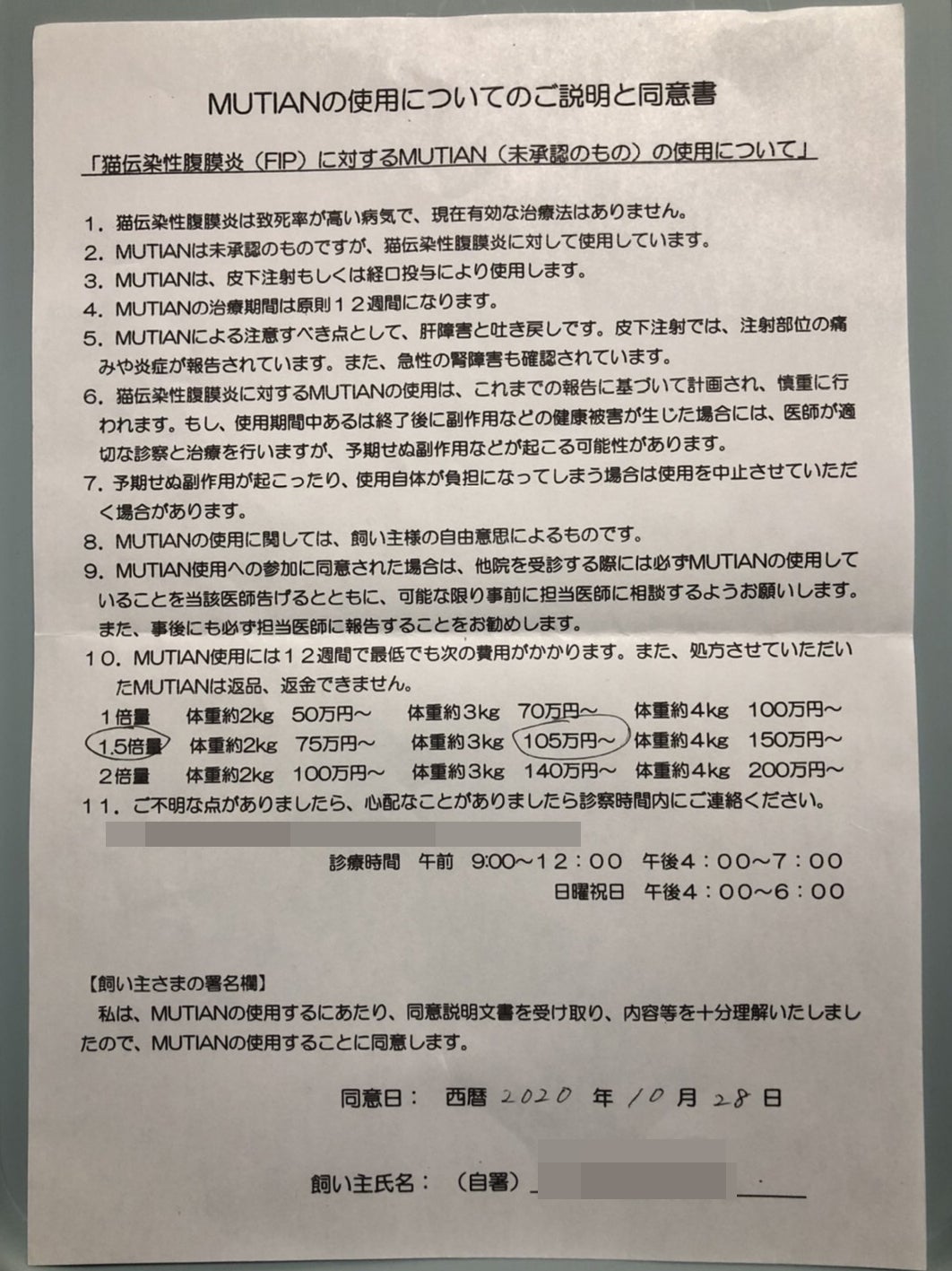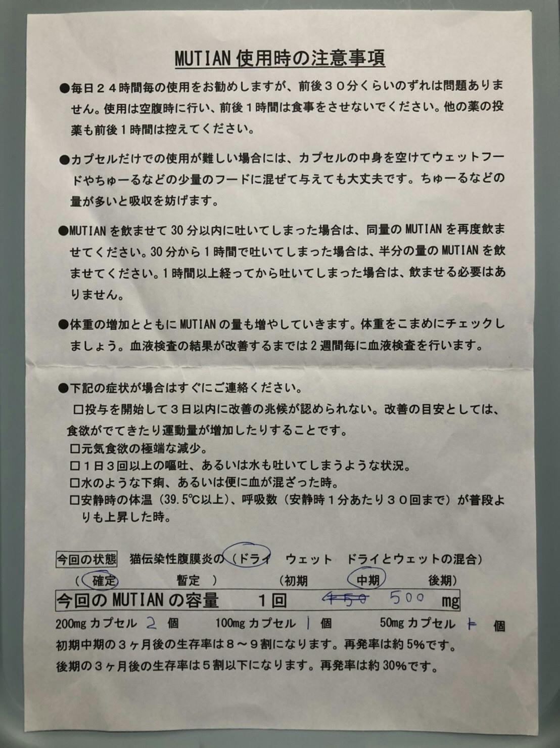 すぐにでもMutianの投与を開始しなければ、ならなかったので10月28日にMutianを16日分購入し、その日の晩にカプセルで投薬いたしました。投薬状況や血液検査、エコー検査の結果また出資明細は「活動報告」にて随時報告させていただきます。