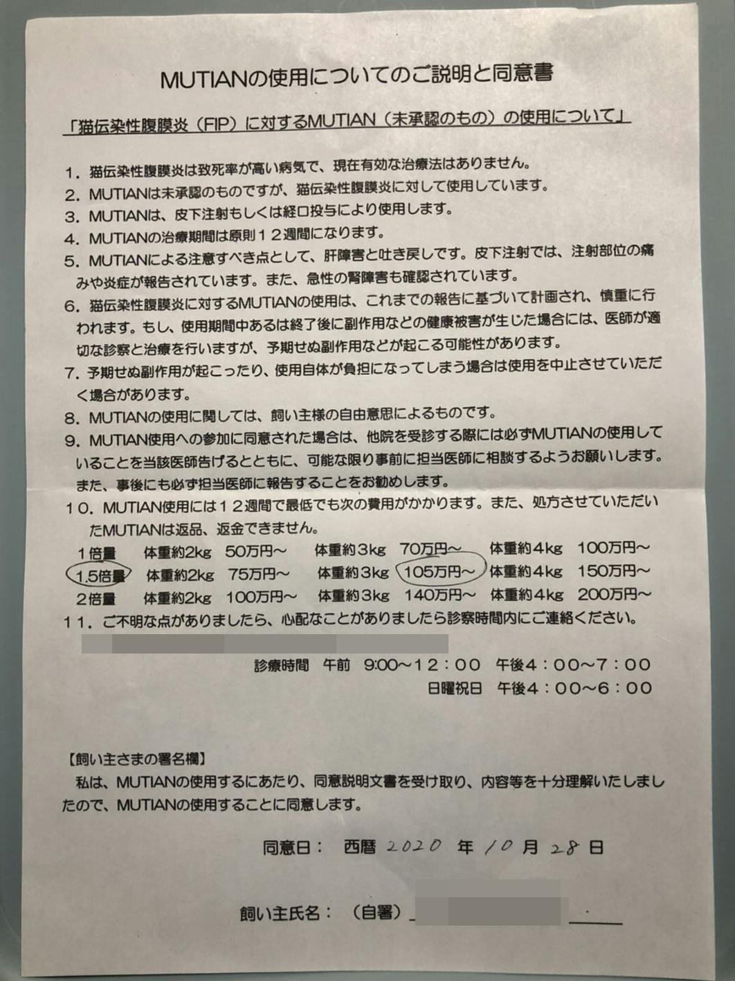 と尋ねると、「獣医師人生で一度だけMutianという薬を投薬し治療している猫の検査を受け持ったことがある」「実際、FIPを発症した猫の数値が回復することはなく、ただただ衰弱していく姿しかみたことがなかったが、Mutianによる治療を行った猫の数値は確かに正常値に戻り、容態も元気になっていた。」と話してくださり、Mutianの存在を教えてくれました。